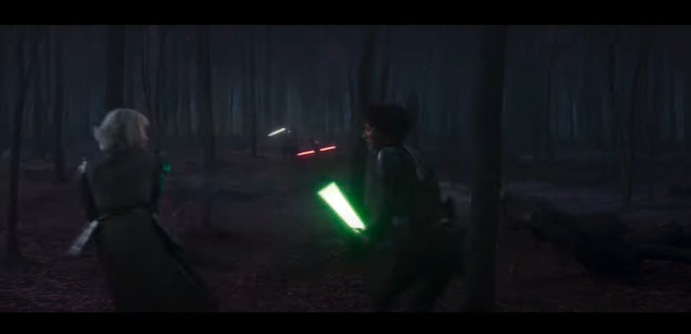 In this scene, Shin almost boops Sabine's nose with her orangish-red lightsaber. Fortunately, Sabine parries... her sword training with Ahsoka obviously paid off.
