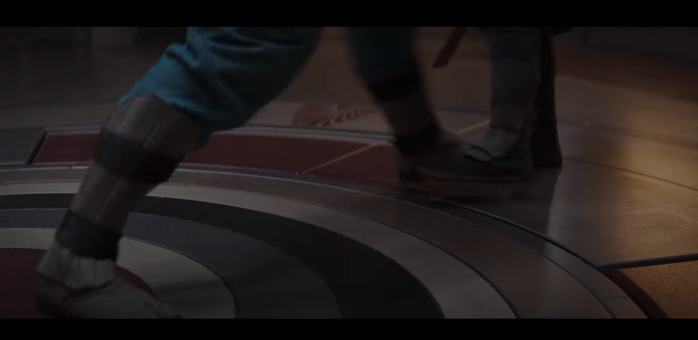 Then we have a distant shot of Sabine and Shin continuing their fight. Off to the left corner, we can see Sabine's Mandalorian helmet in the foreground. She must've removed her helmet before facing Shin or it fell off at some point. Maybe this is symbolic gesture of Sabine fighting blind? A Mandalorian fighting without the aid and protection of her Beskar helmet?